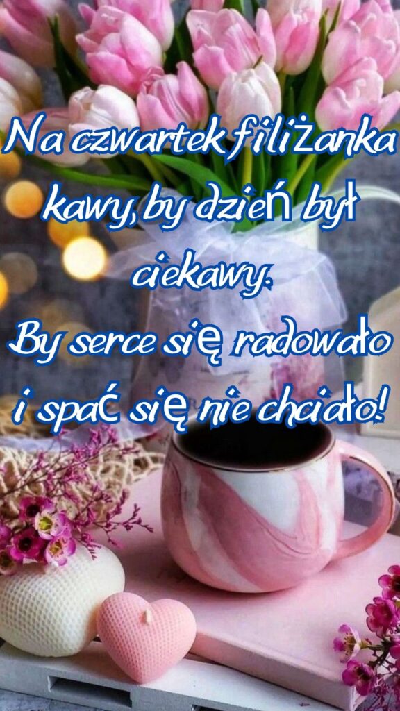 Miłego czwartku życzę Miłego czwartku życzę! 💛💚💛 Dzień dobry, czwartek przetrzymamy i już weekend mamy! Na czwartek filiżanka kawy, by dzień był ciekawy. By serce się radowało i spać się nie chciało! Niech ten czwartek będzie dla Ciebie miły. Słoneczko zaświeci dla Ciebie, aby dodać Ci siły Dzień dobry!Udanego czwartku! Niech bądzie dobry dzień! Dzień dobry!Czwartkowa kawusia dla Ciebiez życzeniami Udanego dnia! Dzień dobry!Uśmiechem przywitaj czwartek! To będzie miły dzień! Pogodnego słonecznego czwartku!